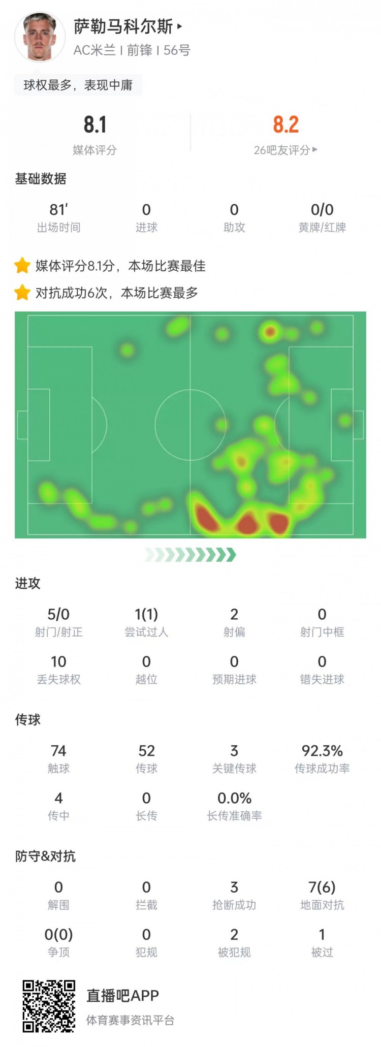 比利时中场萨勒马科尔斯表现抢眼,不仅贡献3次关键传球,更助力球队锁定胜局,赛后获评米兰官方评选的本场最佳球员。